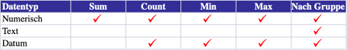 Folgende Aggregationsmethoden stehen für die einzelnen Datentypen zur Verfügung: