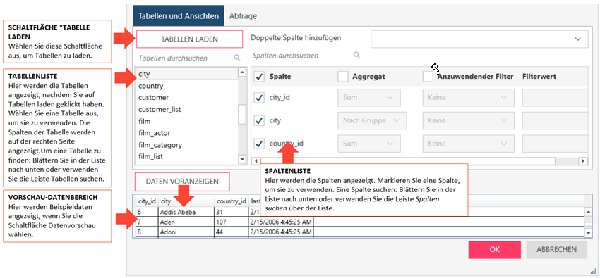 So laden Sie Tabellen und Ansichten anhand von Such- und Auswahlfunktionen.