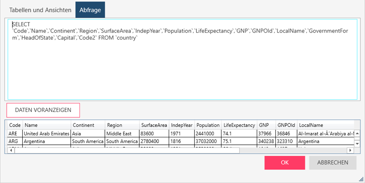 Hier können Sie die Tabellen aus Ihrer Datenbank laden und dann durch Eingabe einer SQL-Anweisung auswählen. Wenn Sie bereits Tabellen und Ansichten ausgewählt haben, wird dieses Feld aktualisiert und zeigt die entsprechende SELECT * FROM TABLE-Abfrage an.