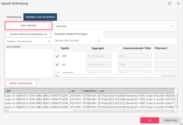 Wählen Sie OK aus, um die Verbindung herzustellen und Daten abzurufen, oder wählen Sie Abbrechen aus, um das Dialogfeld zu schließen. Der Zustand der Schaltflächen OK und VORSCHAU zeigt Ihnen auf einen Blick den Status der Verbindung an: