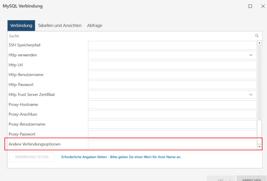 Falls Verbindungsoptionen mit mehreren Zeichenfolgen erforderlich sind, können diese mit einem Semikolon getrennt werden. Verwenden Sie folgende Form: Option1=[Wert];Option2=[Wert];