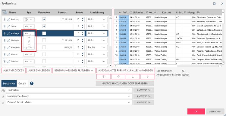 Konvertieren von Spaltentypen über das Dialogfeld „Spaltenliste“