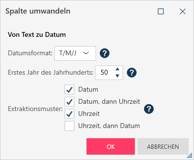 Erstes Jahr des Jahrhunderts: Wird für die Konvertierung zweistelliger Jahre in vierstellige Jahre verwendet. Der Standardwert ist 50. Extraktionsmuster: Die Muster, nach denen bei der Konvertierung von Textwerten in Datums-/Zeitwerte gesucht wird.