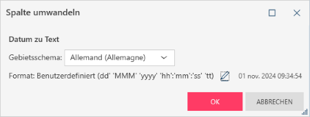 Gebietsschema: Dient zur Einstellung der Sprache bei der Konvertierung von Datums-/Zeitwerten in Textwerte. Format: Wird verwendet, um das Format des Textes zu ändern. Klicken Sie auf das Symbol „Bearbeiten“, um das Dialogfeld Format zu öffnen und das gewünschte Datumsformat des anzuzeigenden Textes festzulegen (d. h. Kurzes Datum, Langes Datum, Kurzes Datum/Uhrzeit, Langes Datum/Uhrzeit, Uhrzeit und Benutzerdefiniert).