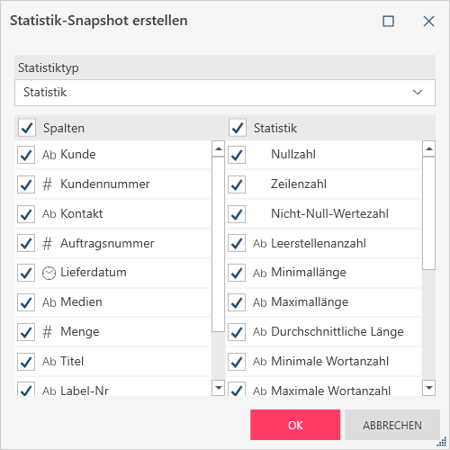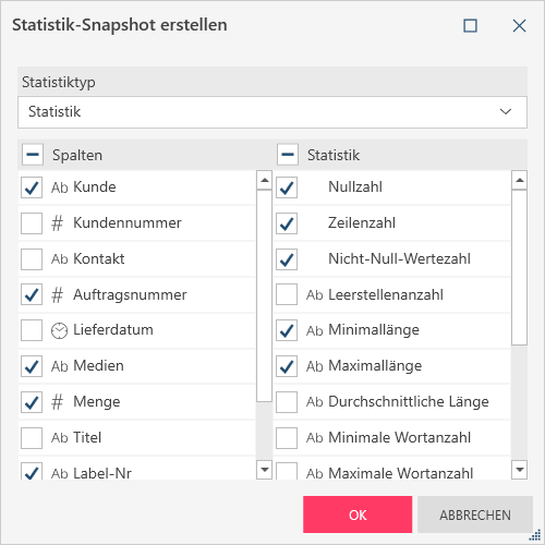 In der linken Spalte des Dialogfelds Statistik-Snapshot erstellen wird eine Liste aller Spalten in Ihrer Tabelle angezeigt, für die Sie eine Statistiktabelle erstellen können. Die rechte Spalte zeigt die verschiedenen Statistiken an, die einbezogen werden können.