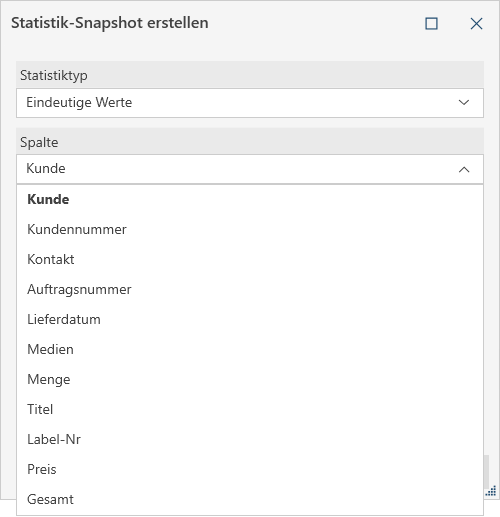 Die Dropdown-Liste Statistiktyp ermöglicht die Auswahl zwischen dem Erstellen einer Tabelle mit verschiedenen Statistiken (z. B. Anzahl der Nullen, der Zeilen oder der Leerstellen, etc.) oder einer Tabelle, die nur eindeutige Spaltenwerte enthält.