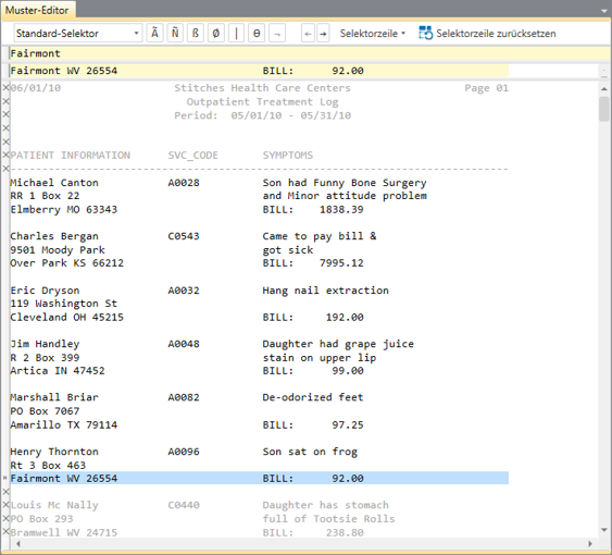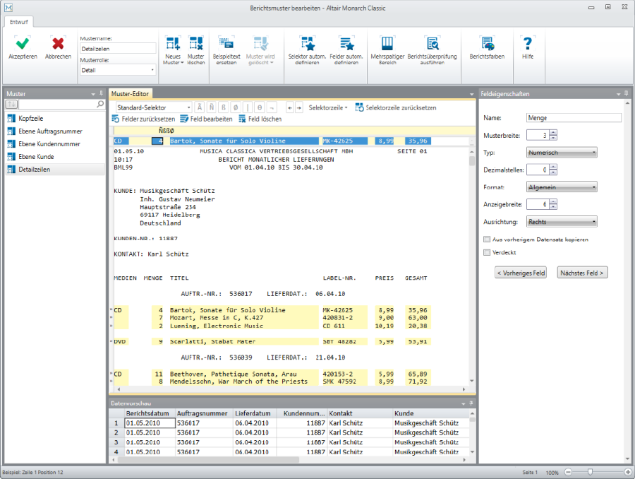 Monarch Classic setzt die Datensätze automatisch zusammen, während Sie in „Berichtsentwurf“ die Detail- und Anhängemuster definieren. Die Felder des Detailmusters dienen als Zellkern für die einzelnen Datensätze. Die mittels Anhänge-, Kopfzeilen- und Gruppenfußzeilenmuster extrahierten Felder werden dann an die einzelnen Datensätze angehängt.