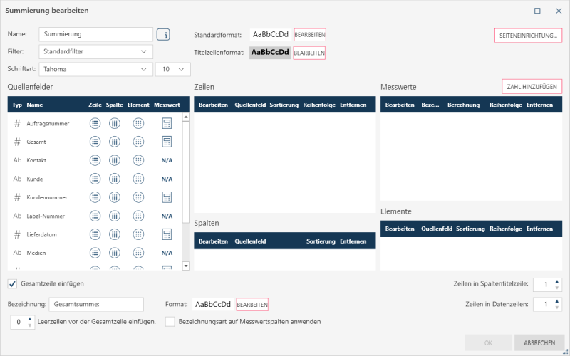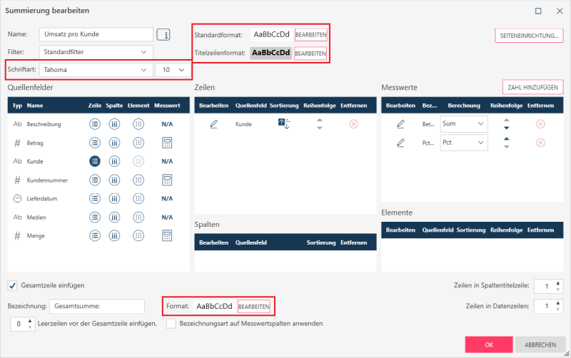 Standardformat: Die hier vorgenommenen Einstellungen werden auf alle Zeilen der Summierung angewendet, mit Ausnahme der Titelzeile und der Gesamtzeile.