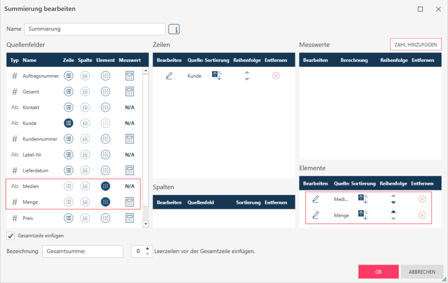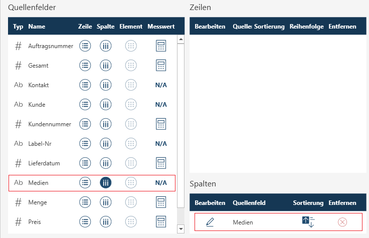 Im nächsten Beispiel wurde ein ZAHL-Feld zu einer Summierungsdefinition hinzugefügt, in der „Kunde“ und „Medien“ als Zeilen definiert wurden.