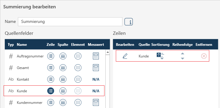 Wenn mehr als ein Messwertfeld ausgewählt ist und Sie die Anzeigefolge der Messwerte in der Summierung ändern möchten, verwenden Sie die Nach oben- bzw. Nach unten-Symbole unterhalb der Spalte Reihenfolge.