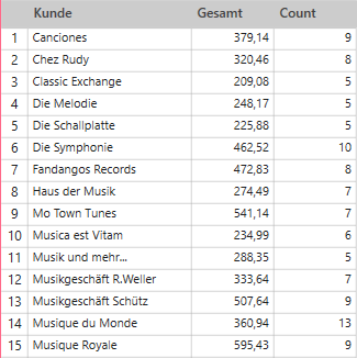 Im obigen Beispiel wurden 9 eindeutige Datensätze für „Die Melodie“ in der Originaltabelle gefunden. Sieben eindeutige Datensätze wurden für „Musikgeschäft Schütz“, und fünf für „Der Musikladen“ gefunden, etc.