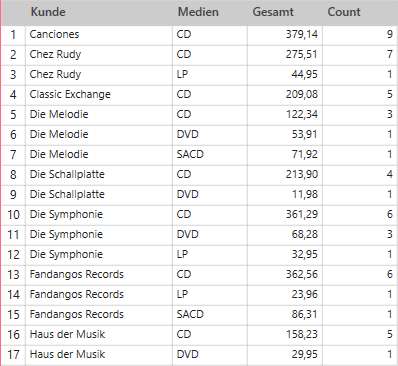 In diesem Fall wurden sechs Datensätze für „Die Melodie“ mit CD-Verkäufen, zwei Datensätze für den gleichen Kunden mit DVD-Verkäufen, und ein Datensatz für einen LP-Verkauf.