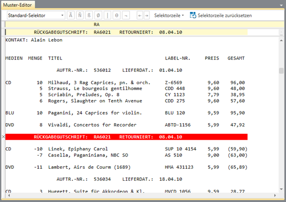 Der erstellte Ausschlusselektor ist so markiert, dass die Zeilen oder Zeilensegmente, die Teil des Selektors sind, nicht extrahiert werden können, selbst wenn ein anderes Muster (z. B. ein Detail oder Anhängemuster) die auszuschließenden Zeilen umfasst. Diese Funktionalität verbessert die Selektierfähigkeit von Monarch Classic und reduziert die Notwendigkeit des Filterns nach der Extraktion.