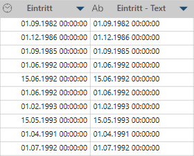 In diesem Beispiel ist Eintritt die ursprüngliche Spalte und Eintritt - Text zeigt die konvertierten Werte.