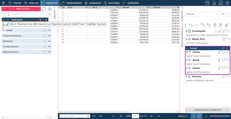 Beim Arbeiten mit Tabellen in Data Prep Studio kann es vorkommen, dass eine oder mehrere vorgenommene Änderungen wieder rückgängig gemacht werden sollen, aber erst nachdem andere Änderungen vorgenommen wurden, die beibehalten werden sollen. Das Klicken auf das Symbol Rückgängig machen