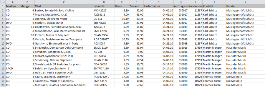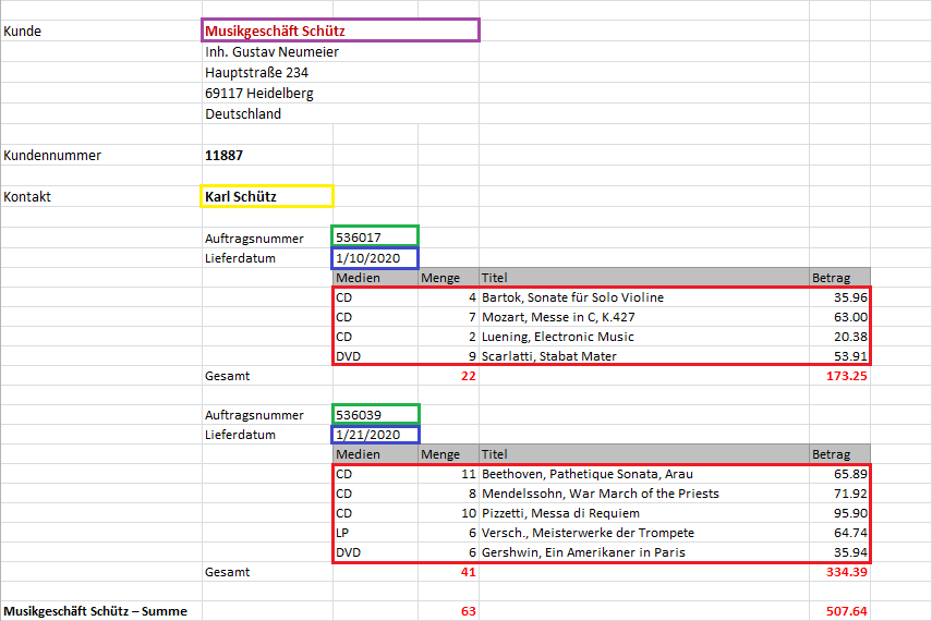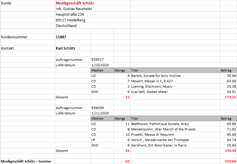 Kunde ist die höchste Sortierreihenfolge, gefolgt von Kontaktperson, Auftragsnummer und dann Lieferdatum. Die Spalten mit den einzelnen Transaktionen befinden sich auf der Detailebene.
