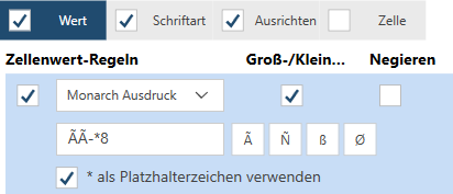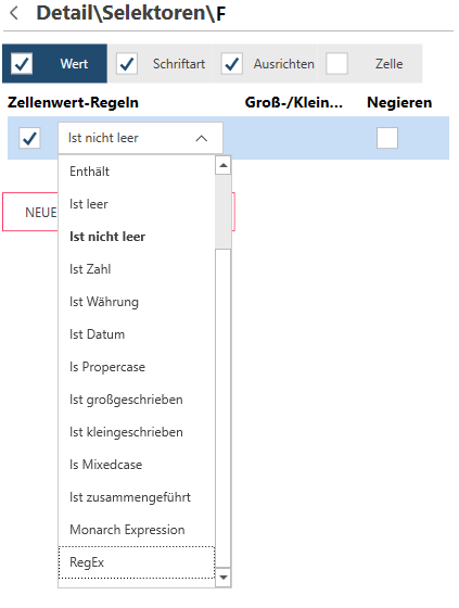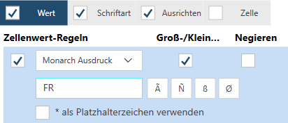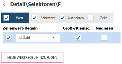 Die Registerkarte Wert dient zum Definieren der Selektoren gemäß den Werten in einer Zelle. Die Wertregeln sind folgende: