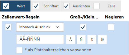 Wählen Sie die Registerkarten Schriftart, Ausrichten oder Zelle aus, um die Schriftart-, Ausrichtung- oder Zellenformat-Selektionsregeln zu bearbeiten.