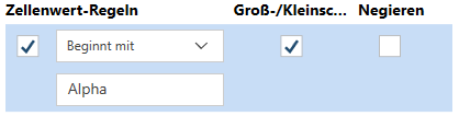 Groß-/Kleinschreibung, um sicherzustellen, dass die Textwerte in Bezug auf die Schreibweise strikt angewendet werden. Beispiel: Wenn der Feldwert Beginnt mit „NORD“ ist und „Groß-/Kleinschreibung“ aktiviert ist, werden Werte, die mit „nord“ beginnen, ignoriert.