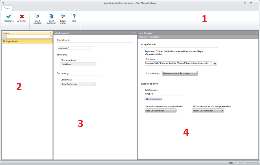 Multifunktionsleiste Zeigt alle Werkzeuge an, die Sie für eine Exportdefinition brauchen. Weitere Informationen finden Sie unter Exportentwurf-Multifunktionsleiste – Referenz. |