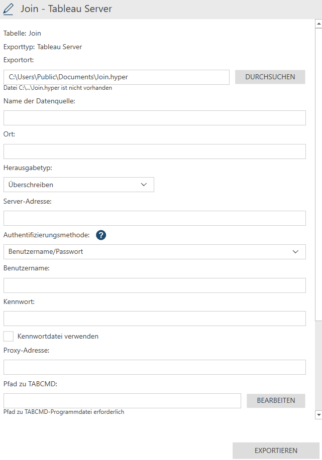 Beachten Sie, dass der Pfad zum tabcmd-Dienstprogramm standardmäßig nicht über das Exportfenster bearbeitet werden kann. Der Pfad zu diesem Dienstprogramm kann nur im Dialogfeld Anwendungs-Standardeinstellungen bearbeitet werden.