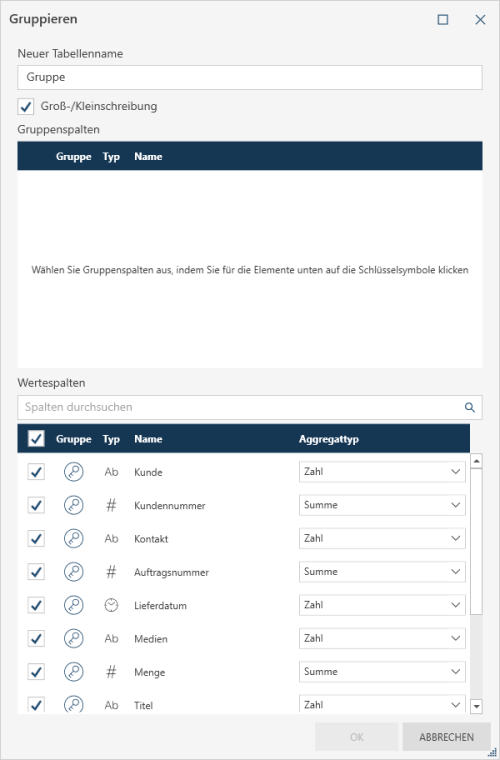 Wählen Sie die zu gruppierenden Spalten aus, indem Sie auf das Schlüssel