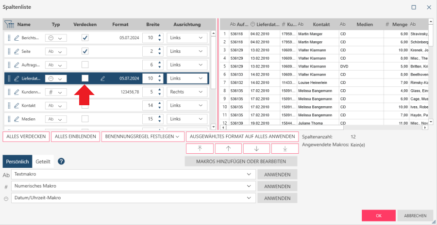 Eine Spalte mit Hilfe des Dialogfeldes „Spalteninformationen bearbeiten/verschieben“ verdecken