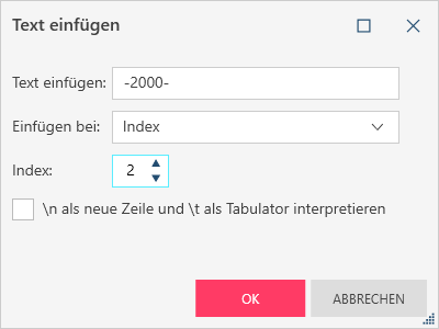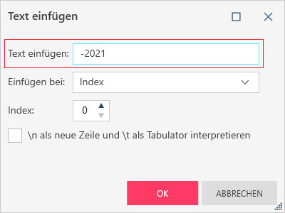 Wenn Sie diesen Vorgang anwenden, werden Sie zuerst aufgefordert, die Zeichenfolge einzugeben, die in das Feld eingefügt werden soll: