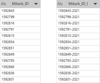 In diesem Beispiel ist die erste Spalte (MITARB_ID) die Originalspalte. Die Textzeichenfolge -2021 wird am Ende alle Zeilen in der zweiten Spalte (MITARB_ID_I) hinzugefügt.