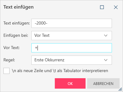 Vor Text – Fügt die Zeichenfolge vor einer angegebenen Textzeichenfolge (Vor Text) ein. Wenn diese Option ausgewählt ist, können Sie auch angeben, bei welcher Instanz (Regel, d. h., erste, letzte, jede) der angegebenen Zeichenfolge Text eingefügt werden soll. Beispiel: Wenn das Feld den Wert AB+CD+EF enthält und Sie die Zeichenfolge -2000- einfügen möchten, indem Sie "Einfügen vor Text", "Vor Text +" und "Regel Erste Instanz" angeben, ist der resultierende Feldwert AB-2000-+CD+EF.