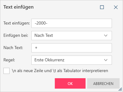 Nach Text – Fügt die Zeichenfolge nach einer angegebenen Textzeichenfolge (Nach Text) ein. Wenn diese Option ausgewählt ist, können Sie auch angeben, bei welcher Instanz (Regel, d. h., erste, letzte, jede) der angegebenen Zeichenfolge Text eingefügt werden soll. Beispiel: Wenn das Feld den Wert AB+CD+EF enthält und Sie die Zeichenfolge -2000- einfügen möchten, indem Sie "Einfügen nach Text", "Nach Text +" und "Regel Letzte Instanz" angeben, ist der resultierende Feldwert AB+CD+-2000-EF.