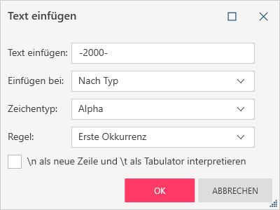 Nach Typ – Fügt die Zeichenfolge nach einem angegebenen Zeichentyp ein (Zeichentyp, z. B. alphabetisch, numerisch, andere druckbare Zeichen/Symbole). Wenn diese Option ausgewählt ist, können Sie auch angeben, bei welcher Instanz (Regel, d. h., erste, letzte, jede) des angegebenen Zeichens Text eingefügt werden soll. Beispiel: Wenn das Feld den Wert ABC1DEF2 enthält und Sie die Zeichenfolge -2000- einfügen möchten, indem Sie "Einfügen nach Typ", "Zeichentyp alphabetisch" und "Regel Erste Instanz" angeben, ist der resultierende Feldwert A-2000-BC1DEF2.