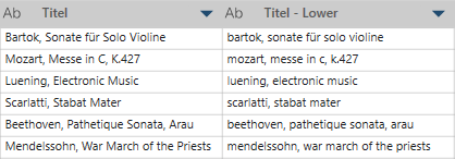 In diesem Beispiel ist Titel die ursprüngliche Spalte und Titel – Lower zeigt die neue Beschreibung, bei der alle Wörter klein geschrieben sind.