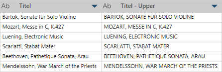 In diesem Beispiel ist Titel die ursprüngliche Spalte und Titel – Upper zeigt die neue Beschreibung, bei der alle Wörter groß geschrieben sind.