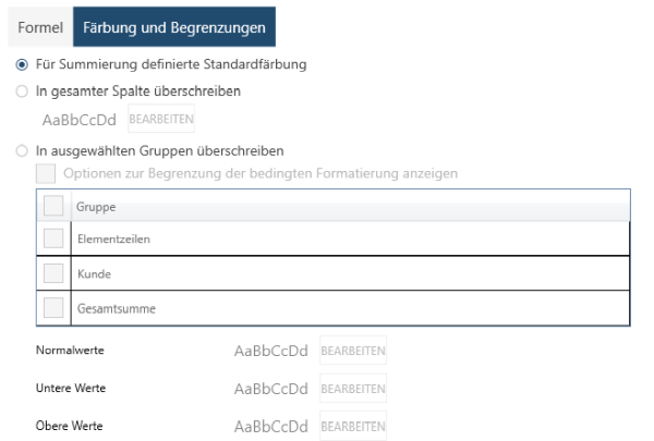 Für Summierung definierte Standardfärbung: Wählen Sie diese Option aus, um die im Dialogfeld Summierung bearbeiten definierten Standardwerte zu verwenden.