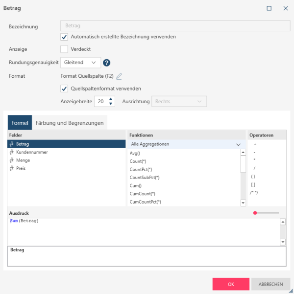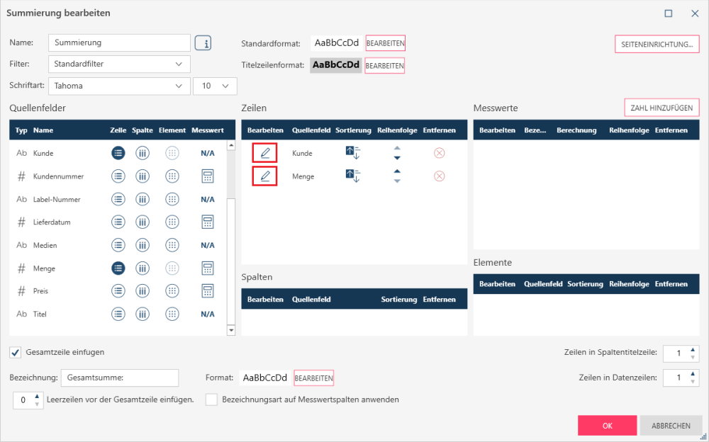 Beachten Sie bitte, dass das Ändern von Feldnamen in der Summierungsanzeige tatsächlich lediglich eine Änderung der Titel bewirkt. Im Dialogfeld Summierung hinzufügen/bearbeiten werden daher weiterhin die ursprünglichen Namen der Quellfelder angezeigt, in der Anzeige der Summierung jedoch die aktualisierten Bezeichnungen.