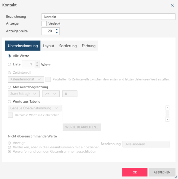 Markieren Sie im Feld Anzeigen das Kontrollkästchen Verdeckt, wenn Sie das entsprechende Messwertfeld ausblenden möchten. Ein verdeckter Messwert kann aber trotzdem noch zu Sortierzwecken verwendet werden. Trotz Verdeckung einer Messwertspalte würde sich der betreffende Messwert aber weiter in gewisser Hinsicht auswirken. Die für einen verdeckten Messwert angegebenen Leerzeilen oder Zwischensummenzeilen würden beispielsweise weiterhin in de Summierung erscheinen. Hinweis: Verdeckte Spalten werden nicht mit exportiert.