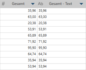 In diesem Beispiel ist Gesamt die ursprüngliche Zahlenspalte und Gesamt – Text die Spalte mit den umgewandelten Werten.