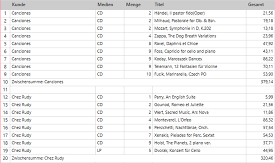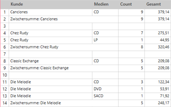 Die Summierung in Abbildung 5 enthält die Schlüsselfelder „Kunde“, „Medien“, „Anzahl“ und „Beschreibung“ sowie das Feld „Betrag“ als Messwert. Diese Summierung zeigt die Transaktionen pro Kunde und unterteilt nach Medientypen. Zwischensummen werden sowohl auf der Ebene der Medien als auch auf der Ebene der Kunden erstellt.