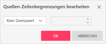 Sie können die Anzahl der zu bearbeitenden Zeilen begrenzen, indem Sie das Symbol Bearbeiten neben Keine Quellenbegrenzung konfiguriert (anwendbar, wenn keine Zeilenbegrenzung festgelegt wurde) oder Zeilenbegrenzung (anwendbar, wenn zuvor eine Zeilenbegrenzung festgelegt wurde) auswählen,