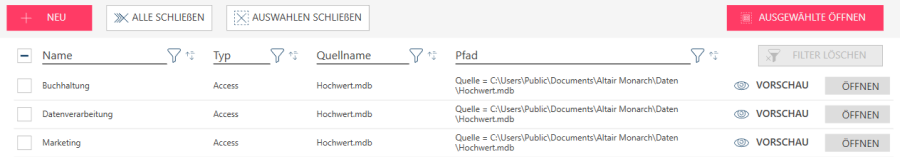 HINWEIS: Tabellen, die aktualisiert werden müssen oder veraltet sind (z. B. aus Connectors, die von Monarch nicht mehr unterstützt werden), werden nicht in der Tabellenliste zur Vorschau angezeigt.