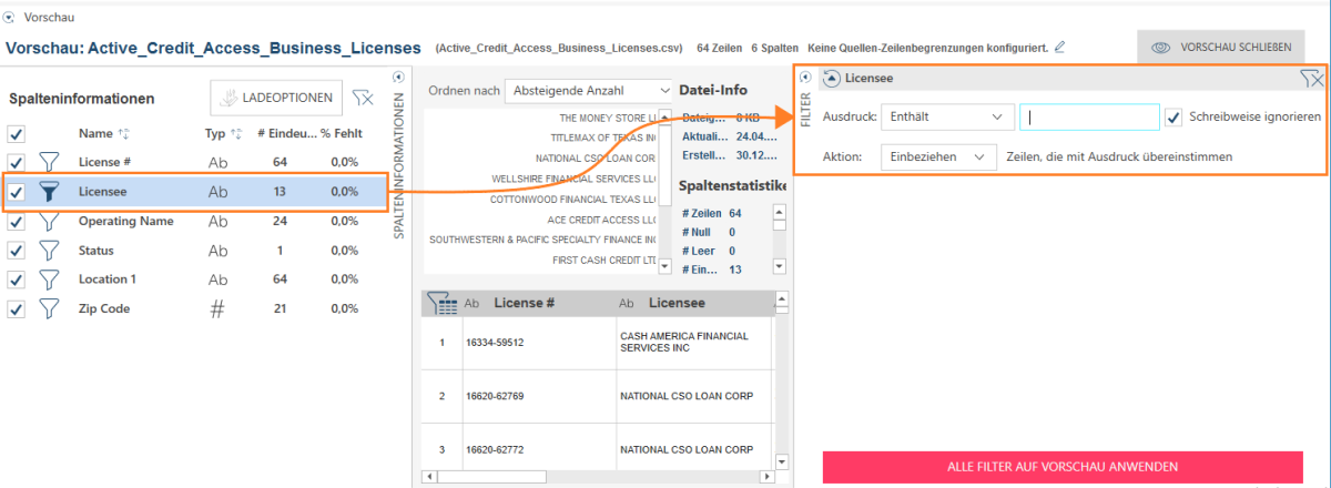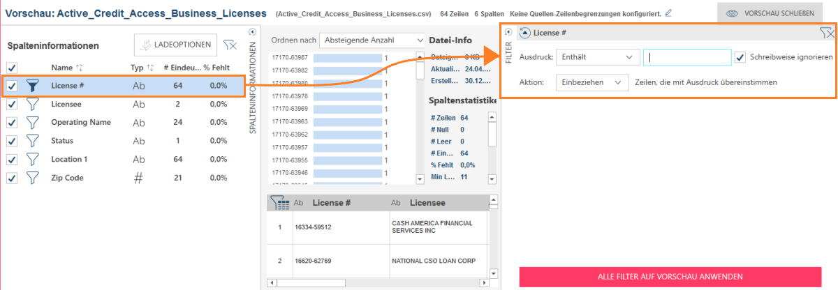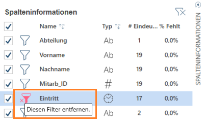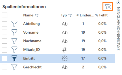 Wenn Sie alle definierten Filter für eine Tabelle im Vorschaumodus verwerfen möchten, klicken Sie auf das Symbol Filter löschen, das sich rechts neben dem Spalteninformationsfeld befindet.