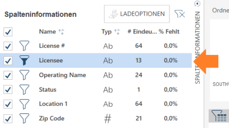 Die Spalten einer in der Vorschau angezeigten Tabelle werden im Unterbereich Spalteninformationen angezeigt. Standardmäßig sind alle Spalten ausgewählt und im Fenster „Vorbereiten“ geöffnet. Wenn Sie eine Spalte aus einer Tabelle entfernen möchten, bevor Sie sie öffnen, deaktivieren Sie das Kontrollkästchen links neben dieser Spalte.
