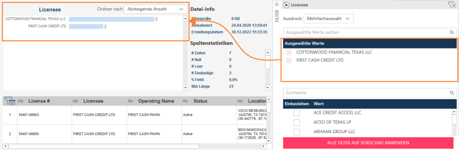 Das Beispiel unten zeigt die Änderungen in der vorangezeigten Spalte, nachdem der betreffende Filter angewendet wurde.