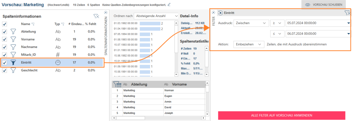 Sie können Datums-/Uhrzeitwerte filtern und nur solche Datensätze in der Vorschau anzeigen, deren Spaltenwerte innerhalb eines Bereichs fallen oder größer bzw. kleiner als ein festgelegter Datumswert sind: