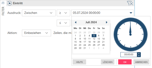 Beim Erstellen von Datums-/Uhrzeitfiltern können Sie einen Datumswert oder eine Uhrzeit angeben. Klicken Sie dazu auf die Dropdown-Schaltflächen neben den Datums-/Zeitfeldern im Unterbereich für den (Datum/Uhrzeit) Filter. Die Steuerelemente für den Kalender und die Uhr helfen Ihnen bei der Auswahl des gewünschten Datums bzw. der Uhrzeit.