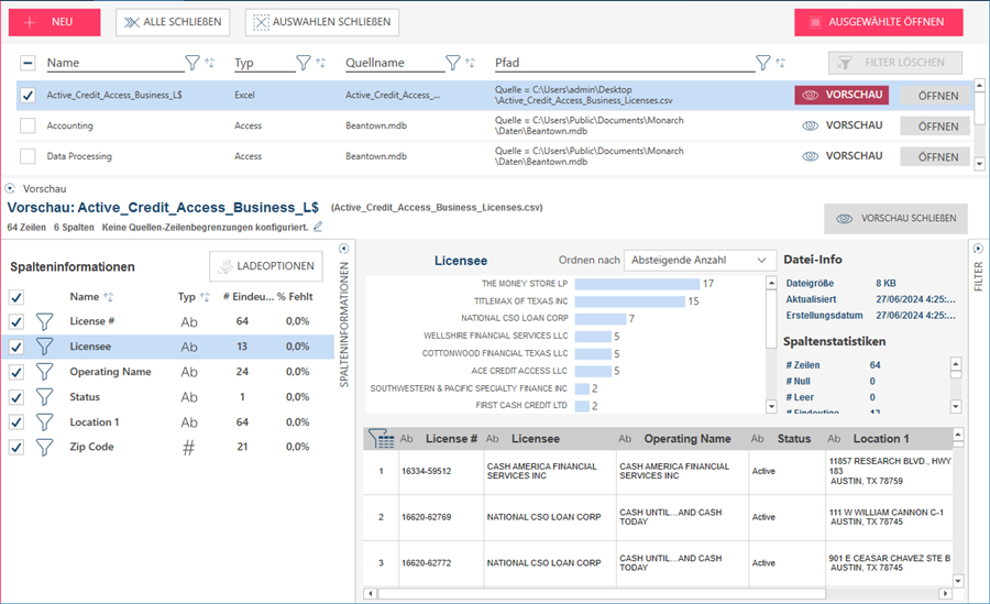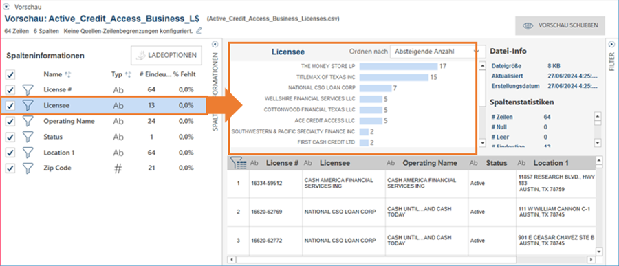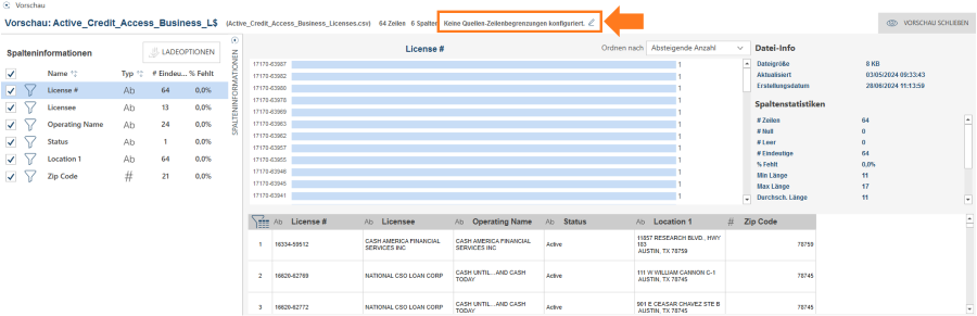 Die Datenvorschau ist ein wichtiger Aspekt der Datenvorbereitung, weil sie das Überprüfen der Informationen und der Datenqualität ermöglicht, bevor Daten in den Arbeitsbereich von Monarch Data Prep Studio geladen werden.