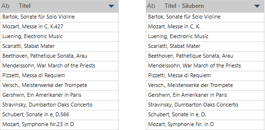 In diesem Beispiel ist Titel die Originalspalte und Titel – Saubern die neue Spalte, nachdem „Numerische Zeichen entfernen“ angewendet wurde.