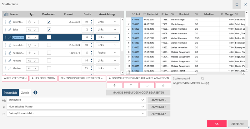 Klicken Sie mit der rechten Maustaste auf eine Spalte und wählen Sie dann Spalteninformationen bearbeiten/verschieben aus dem Kontextmenü aus.
