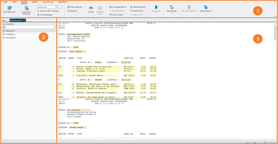 Berichtsansicht ermöglicht die Arbeit mit Berichten. Von der Berichtsansicht können Sie auch Berichtsentwurf starten, um Berichtsmuster zu erstellen oder zu bearbeiten.